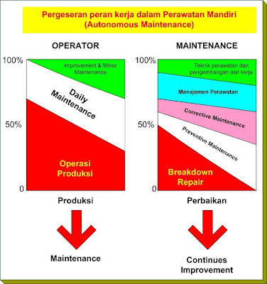 • OPERATOR è Memiliki rasa tanggung jawab untuk merawat (seperti miliknya sendiri), melakukan perawatan harian, membersihkan hingga mengkilap (bebas debu, kotoran dan kebocoran) dan selalu memberitahukan bila ada sesuatu yang menyimpang dan perlu diperbaiki, ditangani dengan segera sebelum proses berhenti dan menghasilak produk rusak.