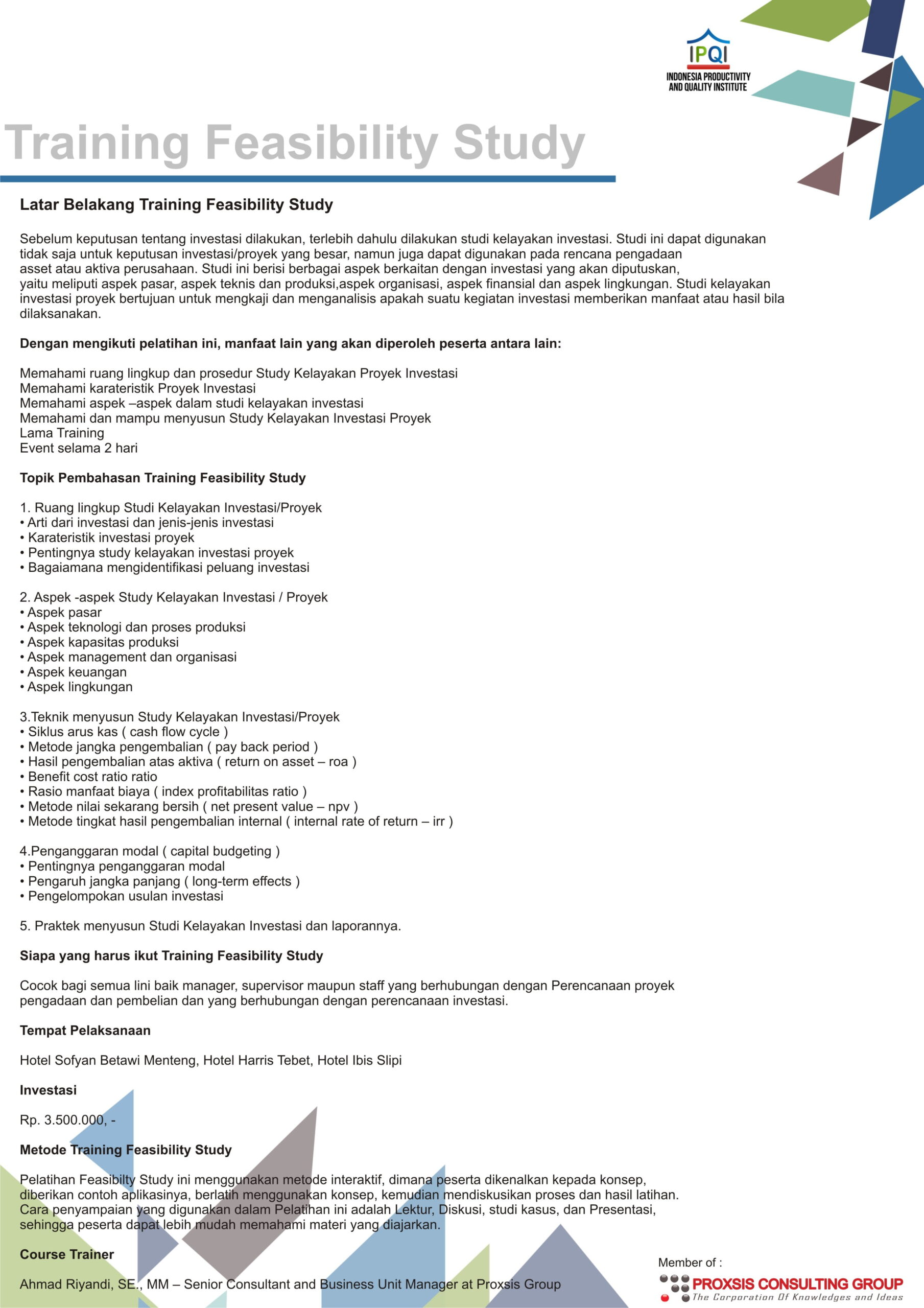 Training Feasibility Study Cocok bagi semua lini baik manager, supervisor maupun staff yang berhubungan dengan Perencanaan proyek, pengadaan dan pembelian