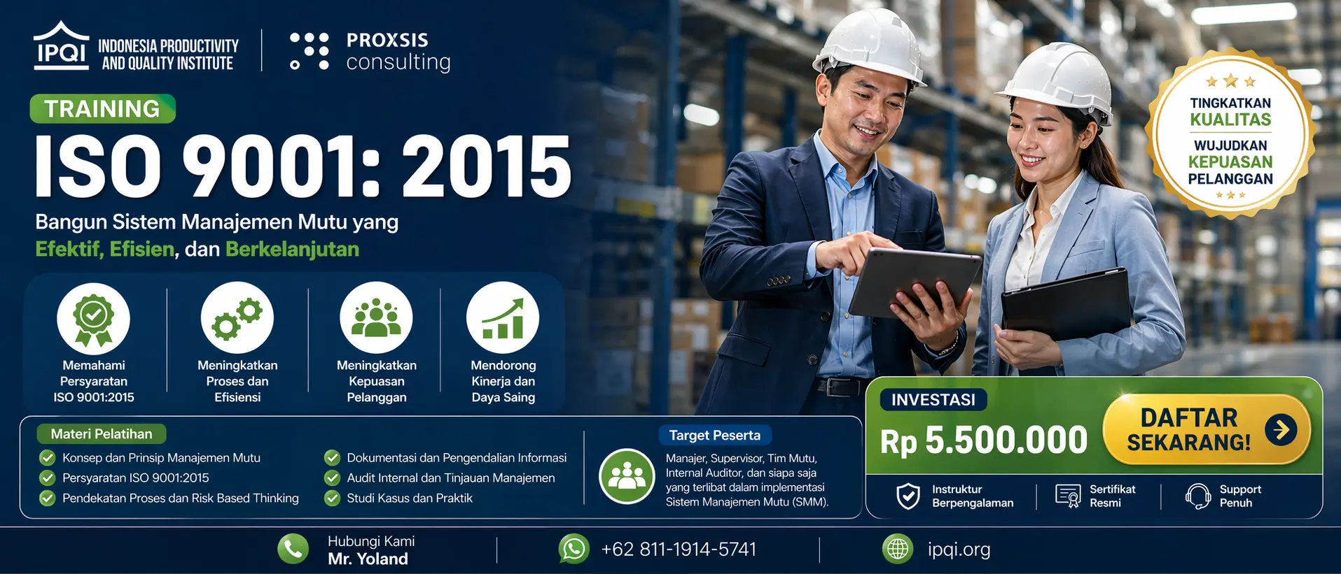 Tanpa sertifikasi ISO 9001, sebuah organisasi tidak hanya kehilangan peluang memenangkan tender bernilai tinggi. Ia juga akan mengalami hambatan struktural dalam menarik investasi. Margin operasional di tengah tekanan inflasi sulit dipertahankan. Kompleksitas bisnis modern pun sulit dikelola.